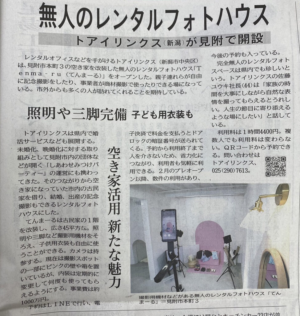 新潟日報 2024年3月29日(金) 朝刊 2024.03.29 見附市に無人のレンタルオフィスとして取材・紹介 されました。 https://www.niigata-nippo.co.jp/articles/-/382445