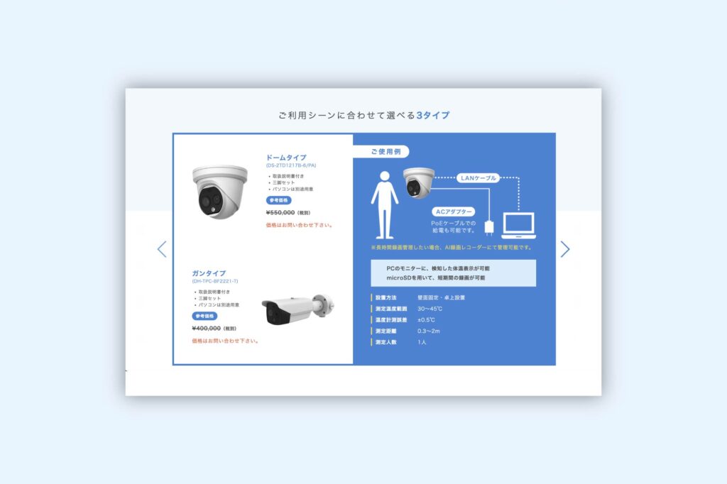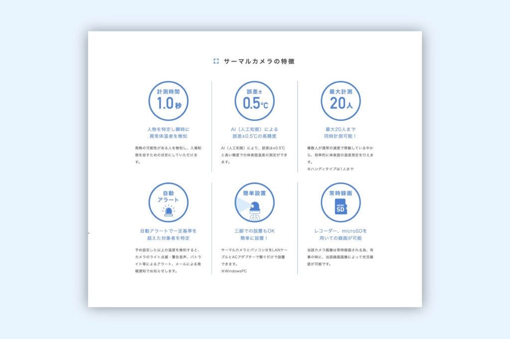 直接肌に触れず、体表面温度を測るカメラ「サーマルカメラ」のランディングページを制作しました。 性能にまつわる数字や、代表的な機能をアイコン化することで端的に情報が伝わるようにしています。 ブルーを基調にすることで清潔感のある、誠実で信頼感のある印象を与えます。